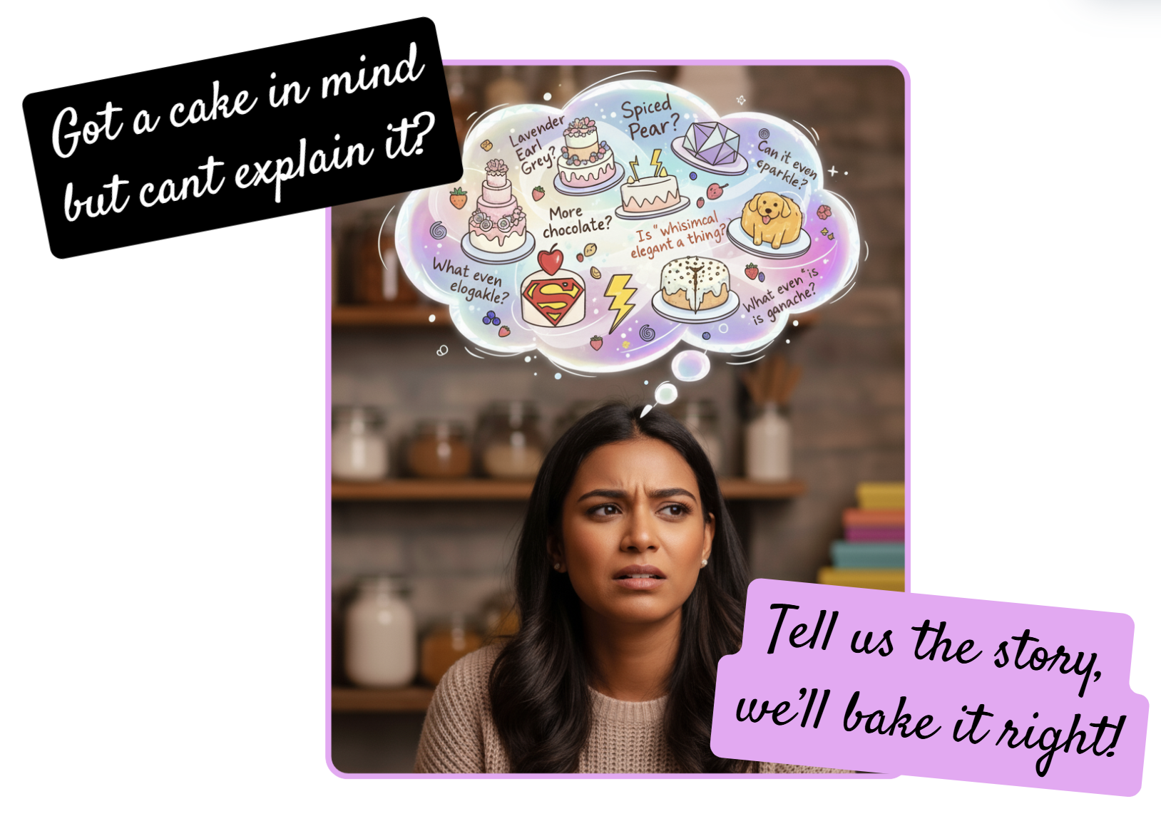 Have a cake idea bubbling in your mind? Share it with us - no matter how unclear, quirky, or classy. We listen, we sketch, we test, and we bake until your vision takes shape in sponge and frosting. From flavors to designs that mirror your moment, we pour every detail into making it yours. Because your celebration deserves more than “just a cake” - it deserves a story you can slice.